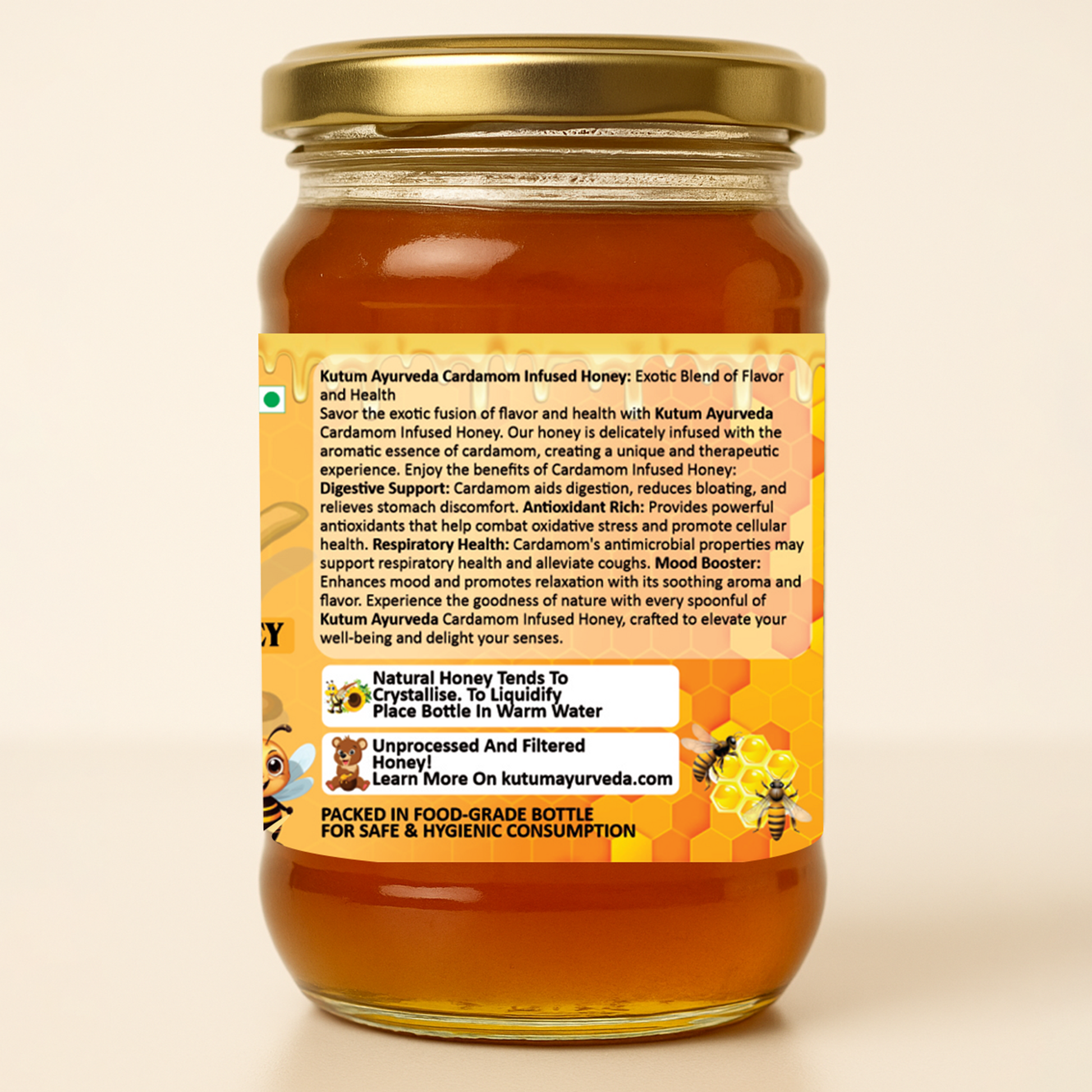 Infused with organic honey and cardamom, this golden elixir offers a delightful taste profile that combines mild sweetness with a hint of aromatic spice.